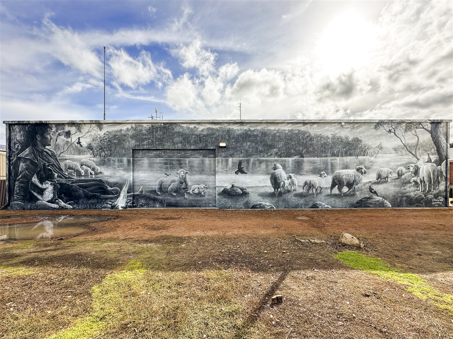 - The first mural on the southern wall of the Boddington Fire Brigade Shed, created by Jacob Butler 'Shakey' with Joseph Boin, tells the story of Henry Boddington, a shepherd from the late 1800s.