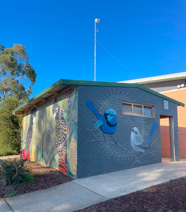 - The second mural in Hotham Park, by Imogen Palmer, Hayley Smith, and Susan Respinger, showcases local flora and fauna, including the Western Whistler and Scarlet Robin.