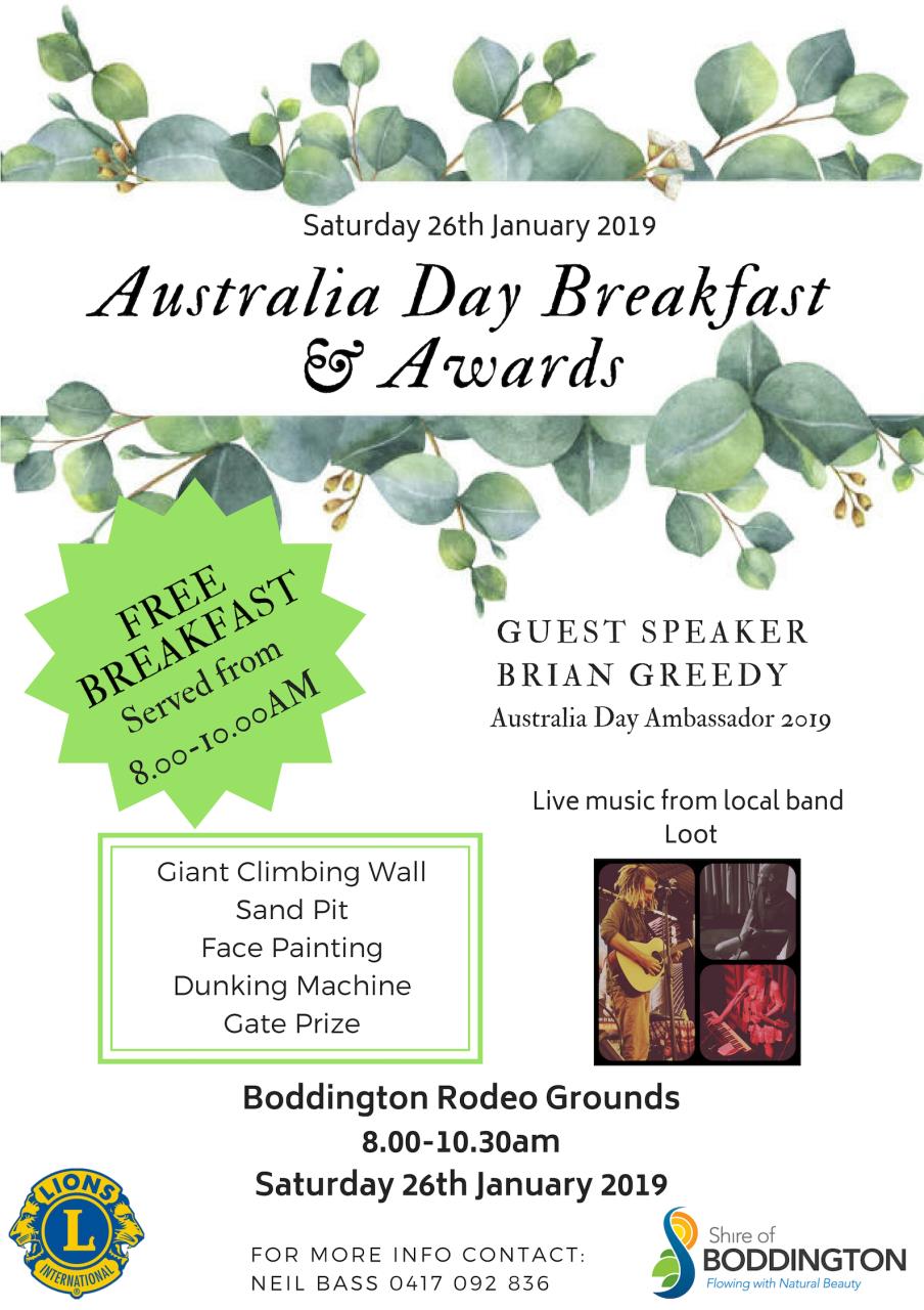 Please click here to view the poster for the Australia Day Breakfast and Awards. Please click here to view the Schedule of Events of the Australia Day Awards Please click here to view the Biography on Australia Day Ambassador Brian Greedy