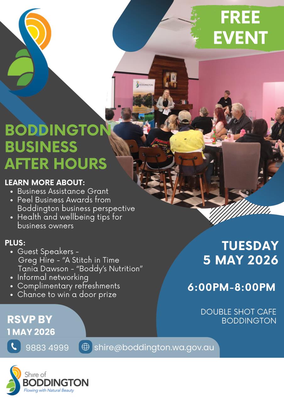 Contact the Shire to update your business details or RSVP to Business After Hours. RSVP by phone 9883 4999 or email shire@boddington.wa.gov.au.