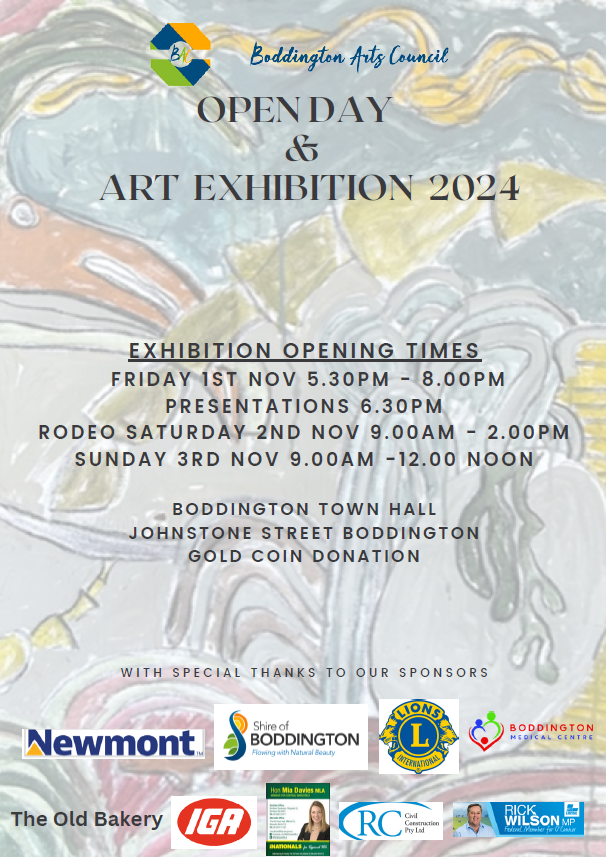 Boddington Arts Council proudly brings you its annual Open Day & Art Exhibition. Entry forms are available at the Boddington Arts Council for the children's lego competition, Youth Art Awards and Painting/Drawing Exhibition. Prize pool is $5000+ Opening Night is 1st November from 5.30pm - awards presented at 6.30pm. Open Saturday 9.00am - 2.00pm and Sunday 9.00am - 12 noon. Sincere thanks to the Shire for providing the venue and for their sponsorship of one of the main prizes. Also thanks to Newmont, Boddington Lions Club, Boddington Medical Centre, The Old Bakery, IGA, Hon Mia Davies MLA, RC Civil Construction & Rick Wilson MP. See entry forms for all details.