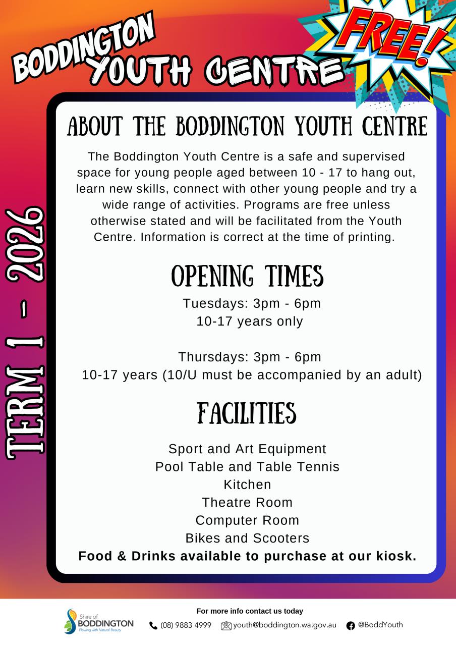 Boddington Youth Centre offers engaging activities and opportunities to build skills and connect with peers. Youth Centre assistants are available on site to provide supervision and support.